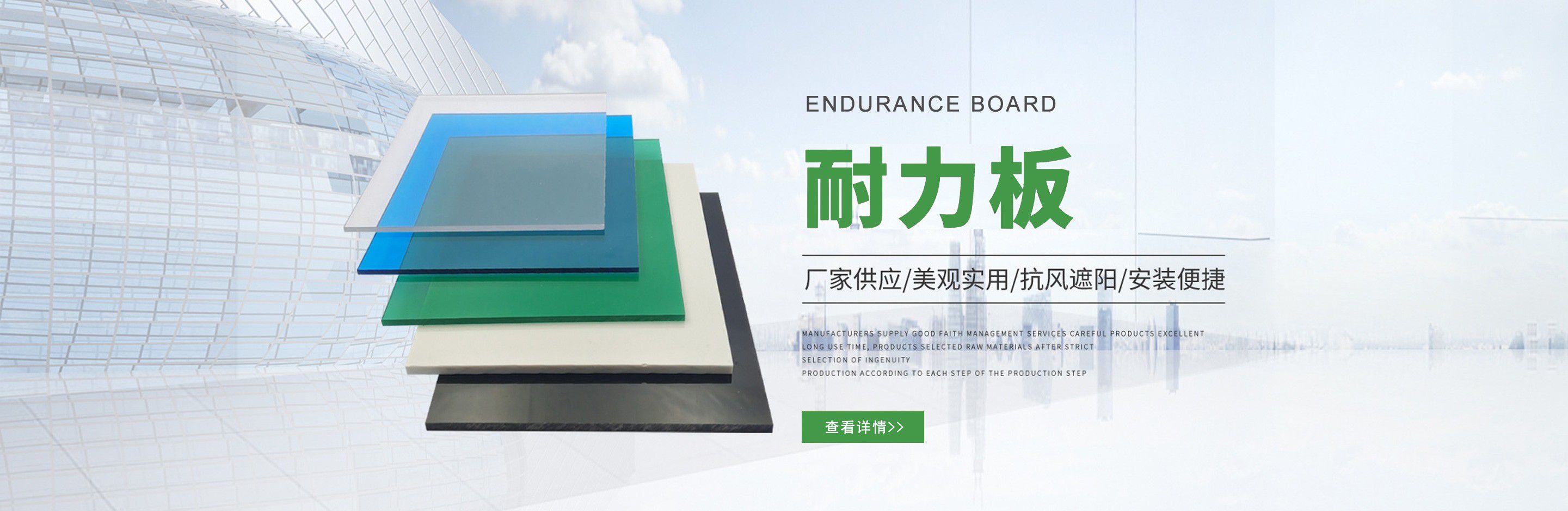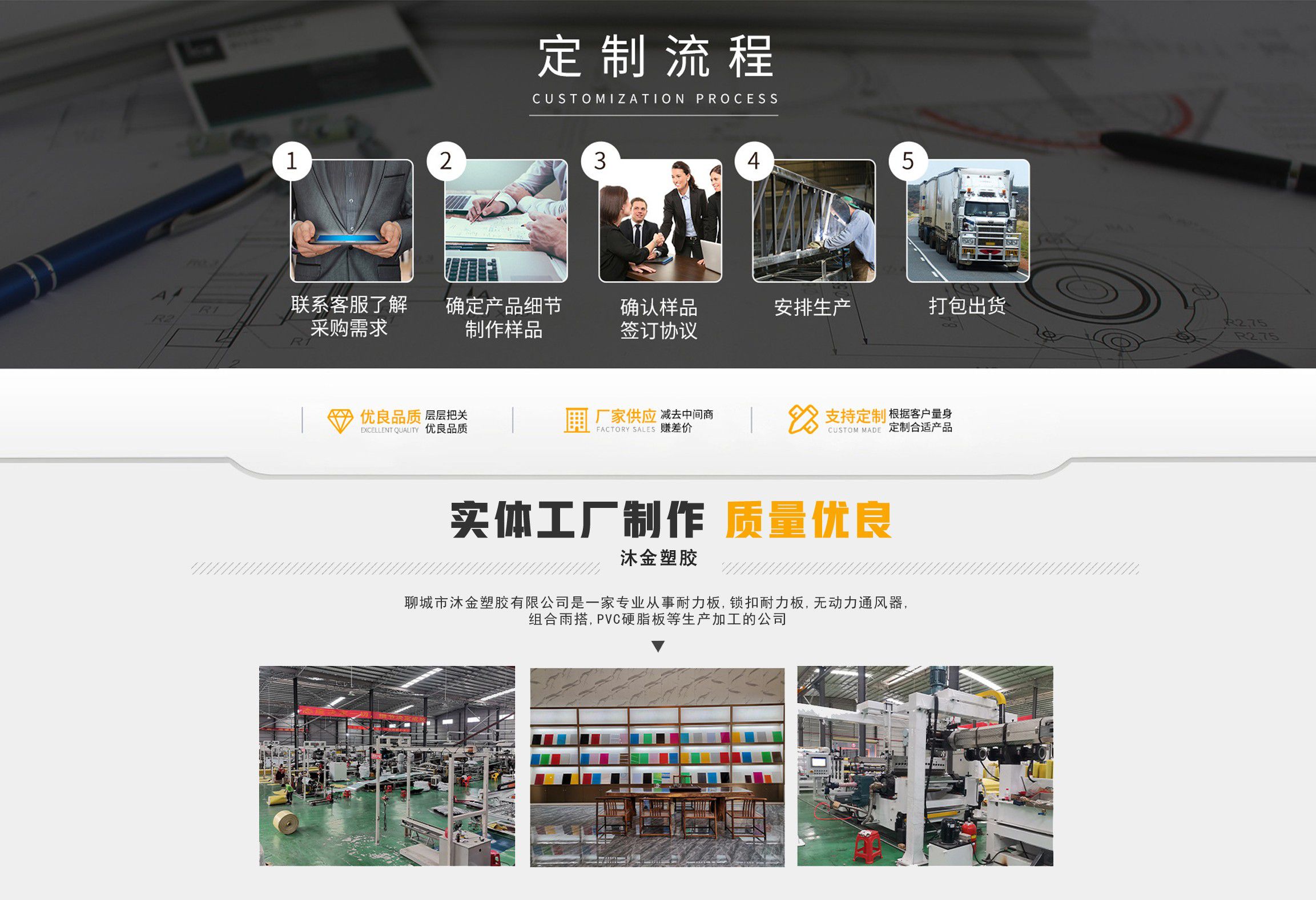 聊城市沐金塑膠有限公司注冊資金2180萬元,占地20000余平方,擁有自建廠房15000平方,員工100余名。10余年來,公司主營耐力板,鎖扣耐力板,耐力板深加工,無動力通風器,組合雨搭,PVC硬脂板,耐力板廠家等板材的發(fā)展戰(zhàn)略,逐漸成長為綜合性企業(yè)?! 」緭碛卸鄺l板材共擠生產(chǎn)線,采用世界知名品牌進口原材料和先進工藝,依據(jù)完善的ISO9001質(zhì)量管理體系和ISO14001環(huán)境管理體系,為產(chǎn)品的卓越品質(zhì)提供了強有力的保證。憑借過硬的創(chuàng)新能力和堅實的硬件基礎(chǔ),贏創(chuàng)已成為國內(nèi)領(lǐng)先的熱塑性板材生產(chǎn)商,產(chǎn)品被廣泛應(yīng)用于建筑業(yè)、農(nóng)業(yè)、工業(yè)、廣告業(yè)、安防行業(yè)及DIY領(lǐng)域?! 」臼冀K致力于通過提供最優(yōu)的板材應(yīng)用解決方案,為客戶創(chuàng)造最高的價值;堅守創(chuàng)新、質(zhì)量、靈活、服務(wù)和速度的核心價值觀;堅持“完美的產(chǎn)品需要完美服務(wù)的支持”的經(jīng)營理念,努力實現(xiàn)成為世界領(lǐng)先的板材與解決方案供應(yīng)商的夢想。 在未來,公司將立足客戶需求,不斷改變和完善現(xiàn)有產(chǎn)品,拓展產(chǎn)品線和充分開發(fā)板材的應(yīng)用領(lǐng)域,為客戶創(chuàng)造全方位的價值。同時更好地實現(xiàn)員工的價值,實現(xiàn)公司團隊的價值。我們將與您一起創(chuàng)贏未來! 企業(yè)使命:成為世界領(lǐng)先的板材與解決方案供應(yīng)商?! 」驹妇埃和ㄟ^提供最優(yōu)的板材應(yīng)用解決方案,為客戶創(chuàng)造最高的價值?! 『诵膬r值觀:質(zhì)量...